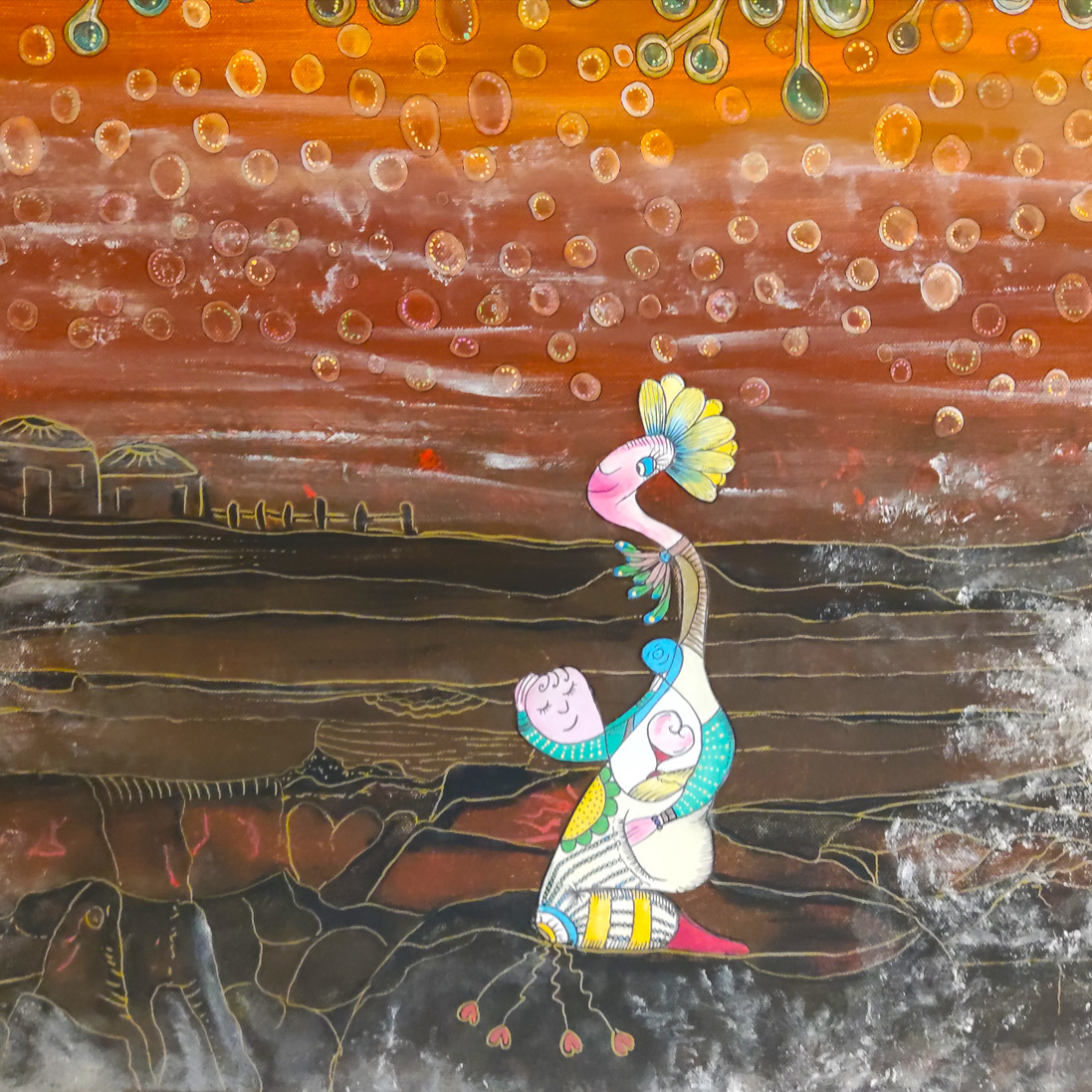 J’invente des univers oniriques en mélangeant plusieurs élèments telles que des dessins au trait, des fonds à base d’encres liquides et de peintures acryliques, des découpages et des matériaux récupérés vissés, cloutés ou collés (nature, recyclerie, don).